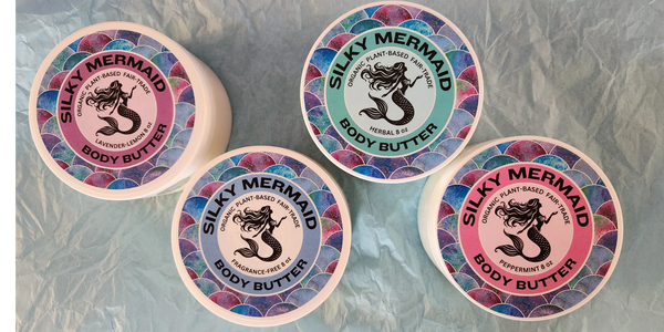 Many skin products contain fillers and chemical ingredients, synthetic fragrances and preservatives. Silky Mermaid body butter is made from the highest quality, fair trade-certified shea butter and simple, plant-based ingredients: grapeseed oil, beeswax, arrowroot starch, and essential oils. All ingredients are organic, gluten-free and never tested on animals. The jars are BPA-free and recyclable.